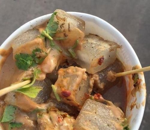 煎焖子。煎焖子的原材料是绿豆,所以看上去颜色带着绿色。它是用工具把绿豆研磨出来之后,熬一些调料放在上面拌一拌,吃到嘴里十分的柔软,滑滑的很美味。虽然这道小吃是北方人在农历二月初二时几乎必吃的美食,但是相信很多人并没有见过。